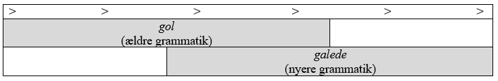 Nu til dags er man ikke i tvivl om at det er formen galede der gælder. Men inden da var der en periode hvor begge former var til stede i sprogsamfundet, og begge former var rigtige! De fulgte bare forskellige grammatikker.